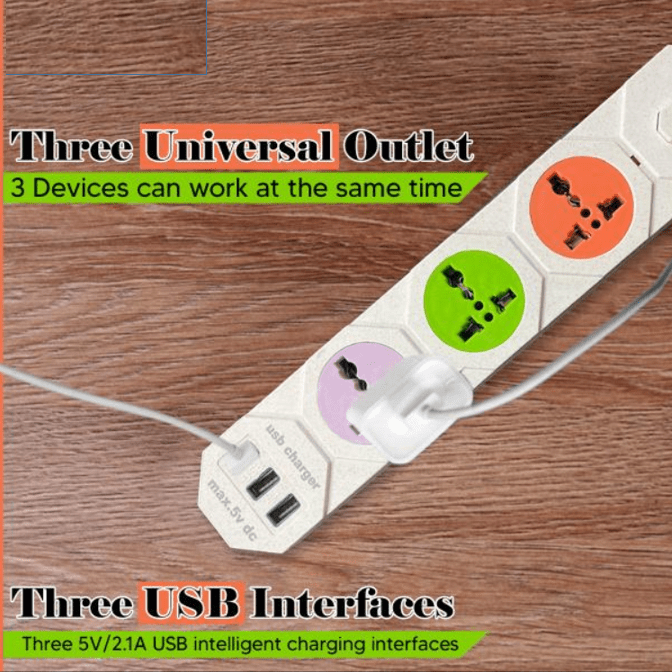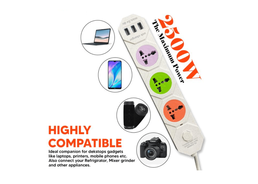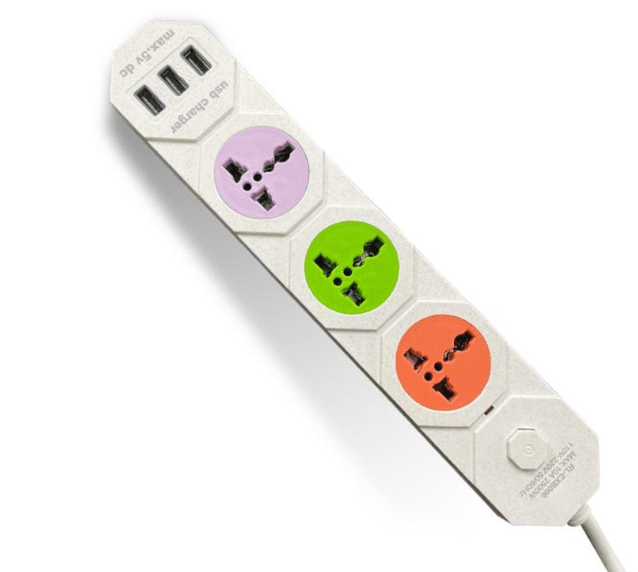 3+1 power strip which comes with 3 international sockets With 3 USB Socket 1 Master switch. Extension board are made from electrical grade plastic,it has built in overload protection with protection against heavy voltage, surge & spikes,heavy duty cables with perfect length provided for safety and convenience, switches are made from good good quality with more excellent switching operation, metal connectors inside has good hardness, elasticity and conductivity which gives low temp. rise and long life. Amp : 10
