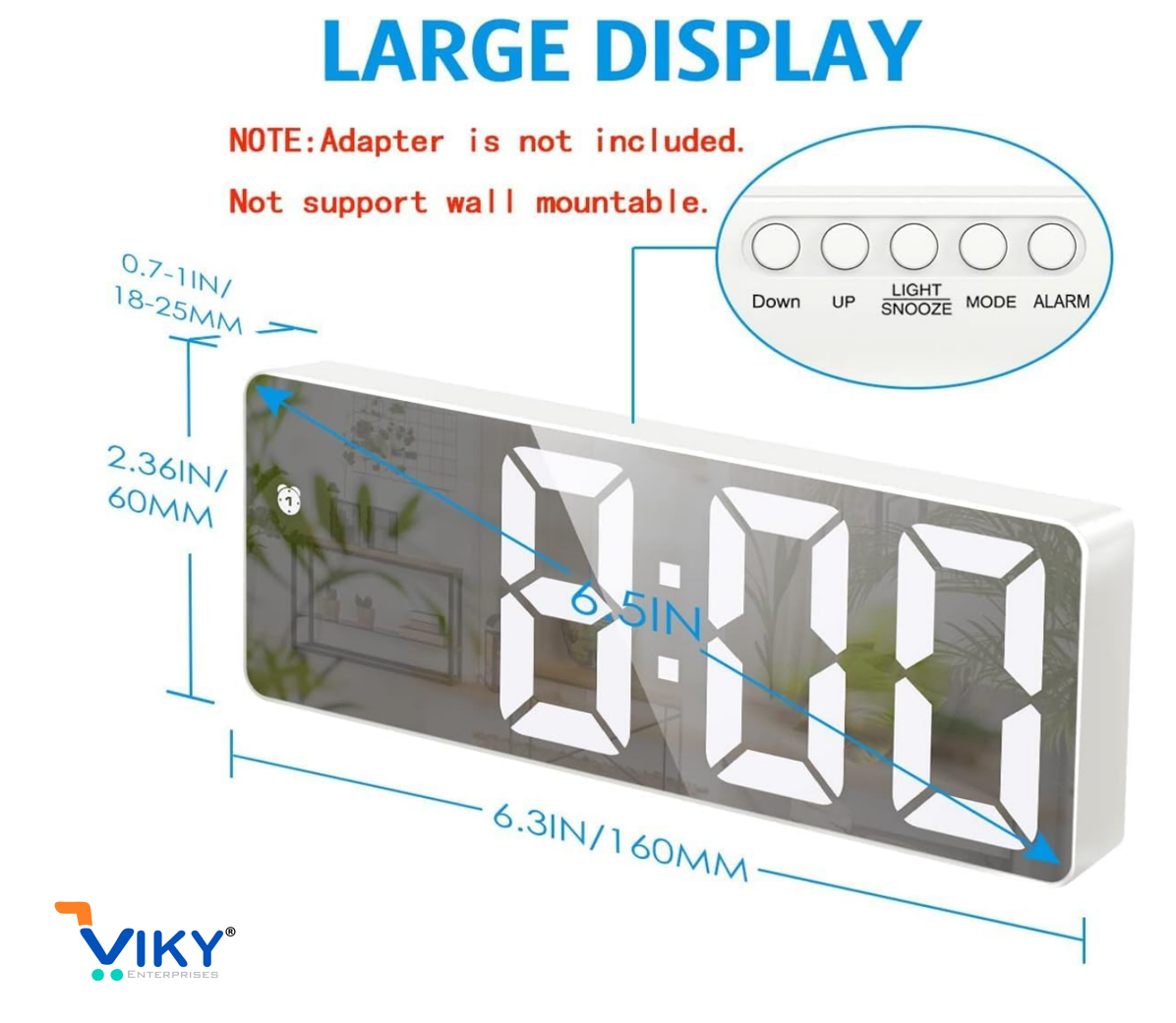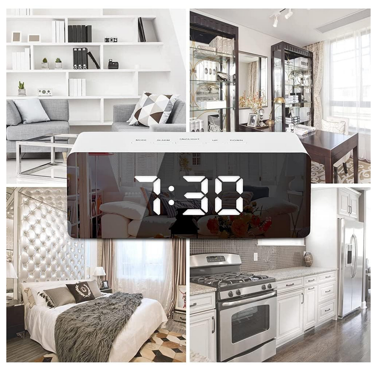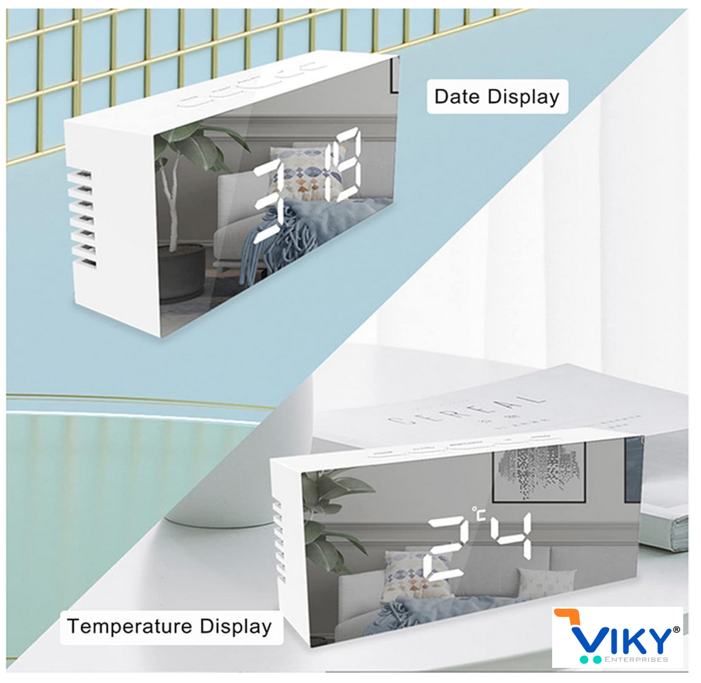 LARGE 6.5-INCH LED MIRROR DISPLAY:- Equipped with a clear mirror-style screen, this alarm clock provides a modern look while displaying time and temperature in high clarity. Ideal for bedroom décor, home, or office use